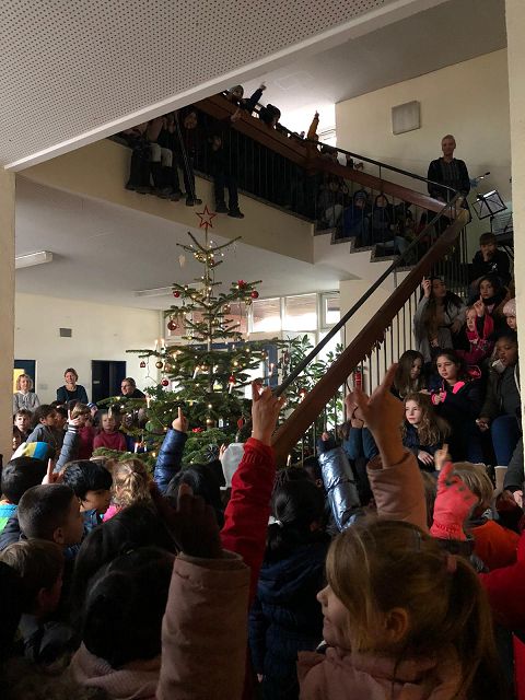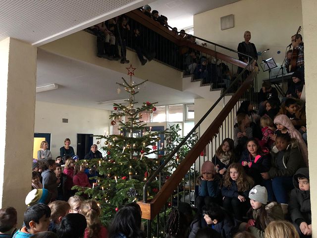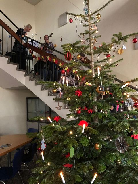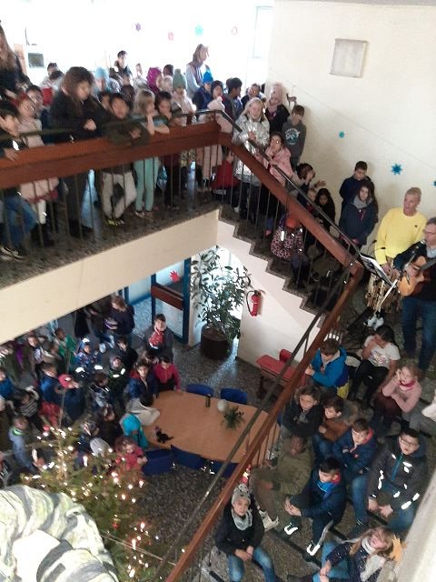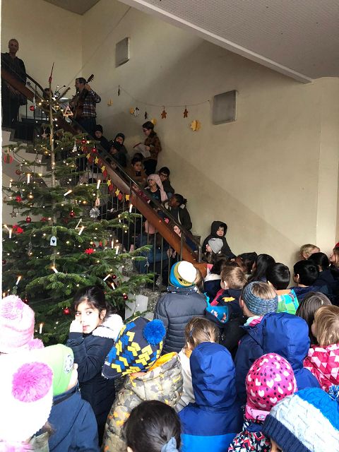 Wenn sich alle Schul- und Vorschulkinder mit ihren Lehrern im Eingangsbereich aufstellen, um gemeinsam einige Lieder wie zum Beispiel „In der Weihnachtsbäckerei", „So viel Heimlichkeit" oder „Wihnachtsmann büst du ol dar“ zu singen, dann hat auch bei uns am Furtweg endlich die Adventszeit richtig begonnen. Herr Rother mit seiner Gitarre und Frau Goossens auf Keyboard begleiten uns dabei tatkräftig. Dieses geschieht am Montagmorgen rund um unseren beleuchteten Weihnachtsbaum nach dem 1., 2. und 3. Advent. Anschließend gehen wir fröhlich beschwingt in die große Pause.