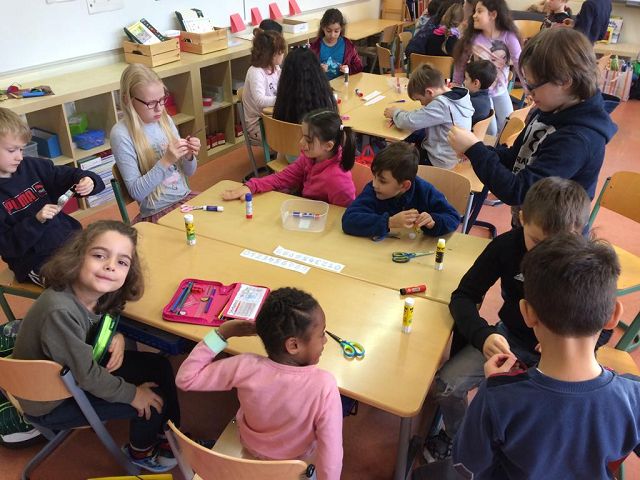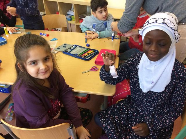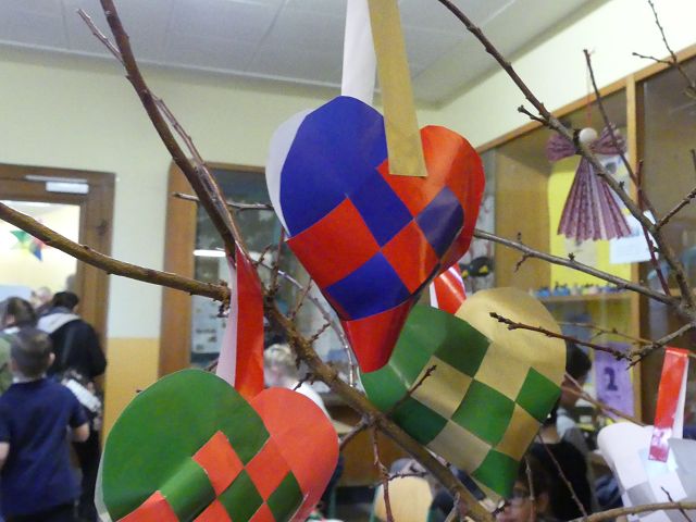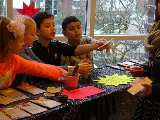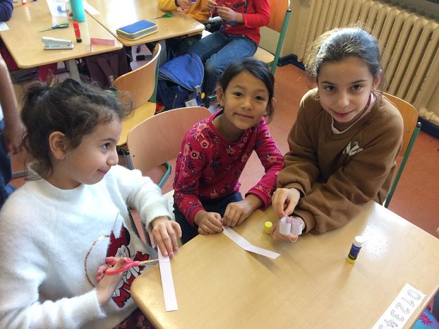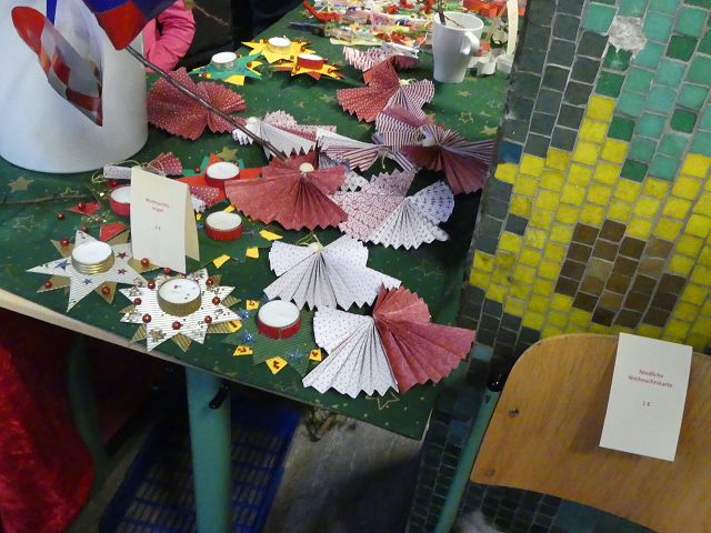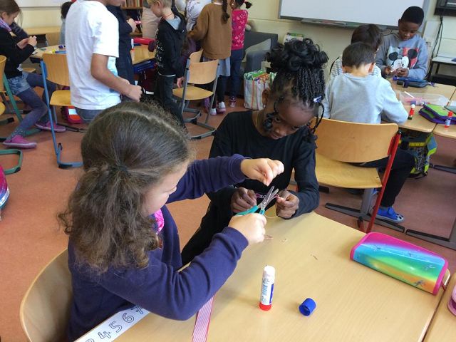 Die Bastelarbeiten für die Verkaufsstände der Klassen laufen schon auf Hochtouren. Hier bekommen Sie einen kleinen Eindruck davon. Die Klasse 1b bastelt mit der Klasse 3b, ihrer Patenklasse, Papierherzen.