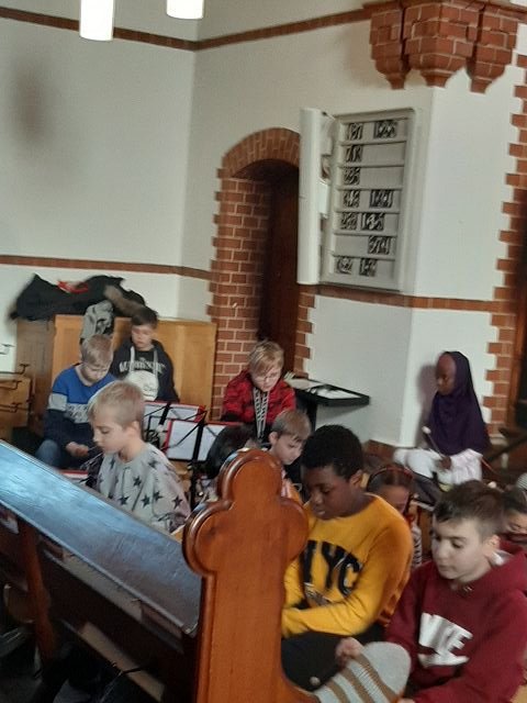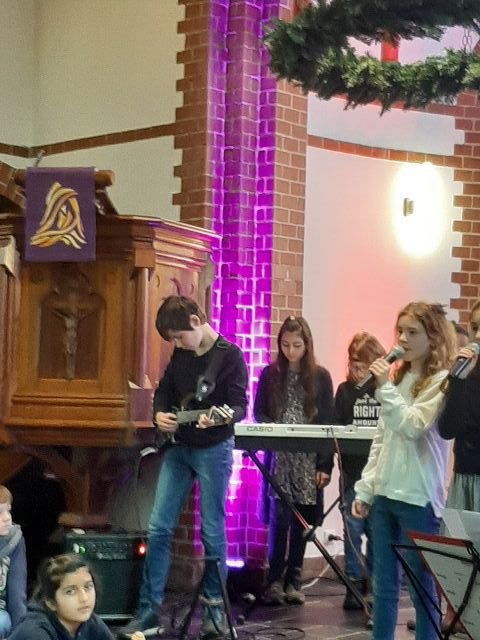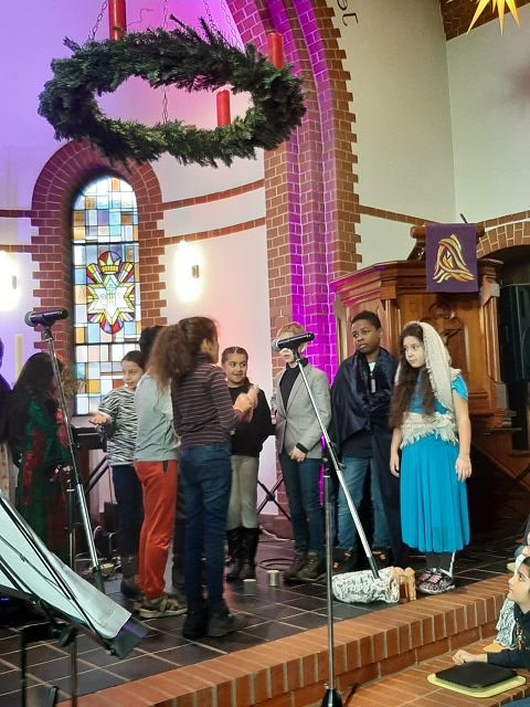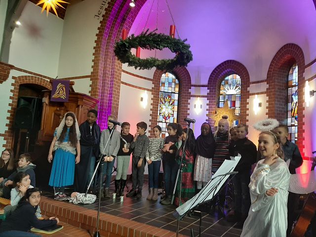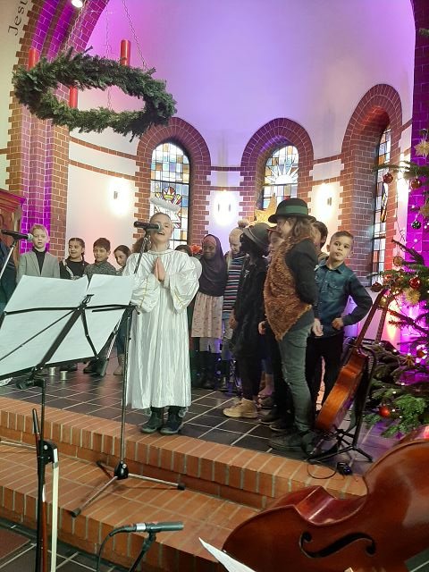 Mittlerweile ist es zur Tradition geworden, dass kurz vor Weihnachten und wenn sich das Jahr dem Ende neigt, sich die Schülerinnen und Schüler unserer Schule in die Elisabethkirche in Eidelstedt begeben, um dort eine stimmungsvolle Weihnachtsfeier zu erleben. In diesem Jahr stand die Feier unter dem Motto „Wärme kann man teilen“. Herr Rother, Frau Goossens, Frau Heise, unsere Verkehrspolizistin und Katharina Kutzner aus unserer GBS-Leitung übernahmen die musikalische Begleitung mit Gitarre, Bass, Blockflöte und Violine. Auch die Schülerinnen und Schüler trugen zu der Feier bei. Der Wahlpflichtkurs Chor und die Schulband begleiteten den Gesang, angeführt von unserem Musiklehrer Herrn Rother. Die Klasse 3b mit Frau Rothländer hatte sich fleißig auf unsere Feier vorbereitet und führte uns ein Krippenspiel vor.