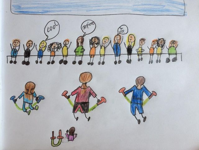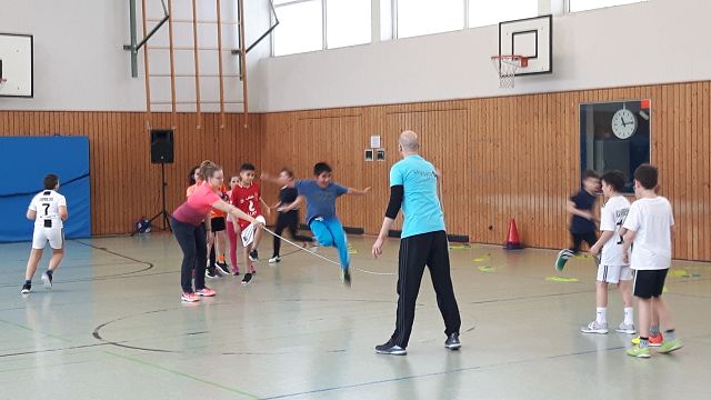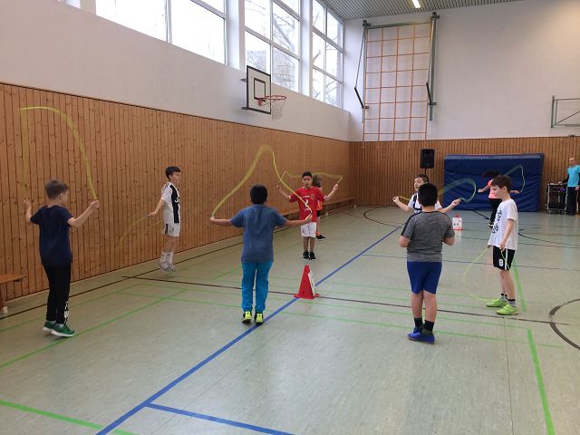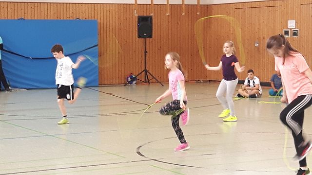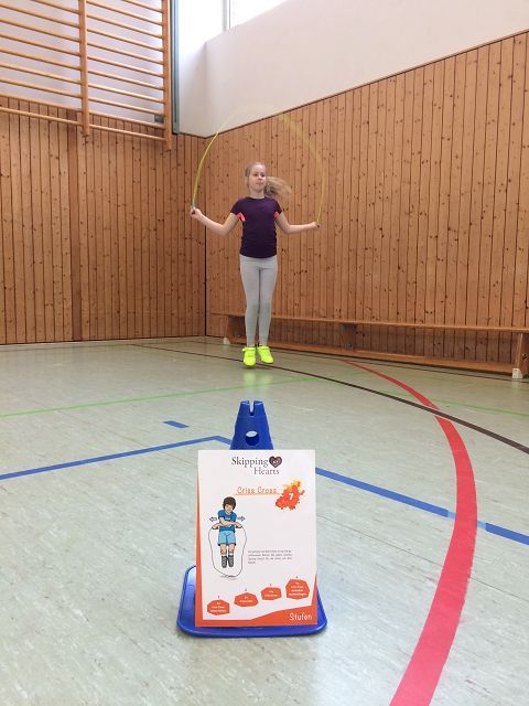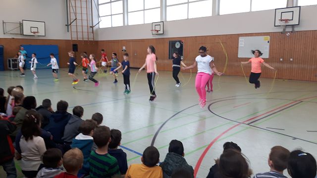 Als Nächstes machten wir bei der Aktion „Skipping Hearts“ der Deutschen Herzstiftung e.V. mit und absolvierten einen Basiskurs im Rope Skipping. Dabei lernten wir, dass Seilspringen die Herzgesundheit fördert und somit lange fit hält. Wir übten anschließend verschiedene Einzelsprünge, Partnersprünge und eine gemeinsame Präsentation am Langseil. Nach einer kurzen Pause präsentierten alle, was wir mit Seil und Musik eingeübt hatten. Einige Eltern sowie die 3. und 4. Klassen waren eingeladen zuzuschauen – und auch die Patenklasse 2b war zum Zuschauen gekommen. Die Vorführung war ein voller Erfolg, und es gab viel Applaus. Danach durften auch die Zuschauer selbst aktiv werden und die tollen Seile ausprobieren.