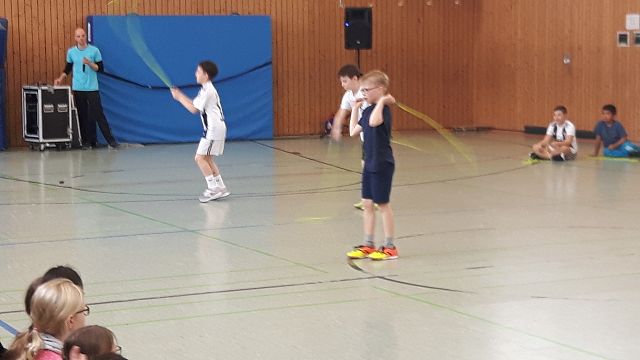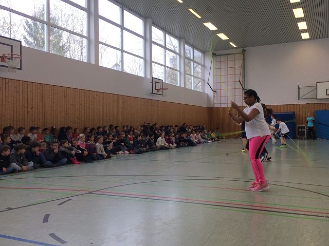 Eine Klasse war besonders gespannt, als der Tag endlich gekommen war: Die Klasse 4b übte nämlich seit zwei Monaten eine Rope-Skipping-Choreographie im Sportunterricht. Im Vorprogramm der heutigen Zirkusvorstellung durften die "Springmäuse" ihre Show allen vorführen. Die Aufregung war riesengroß, aber es hat alles wunderbar geklappt.