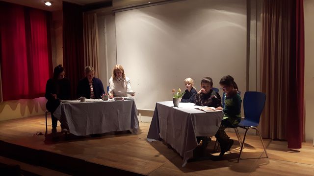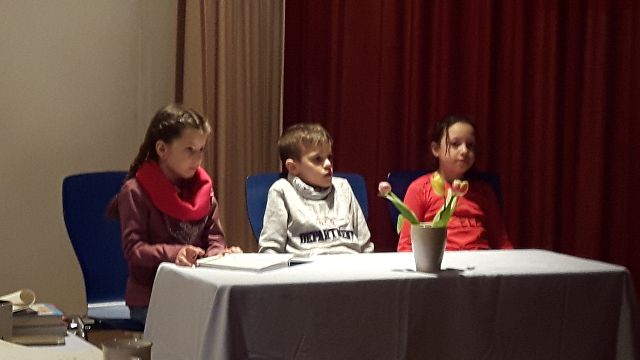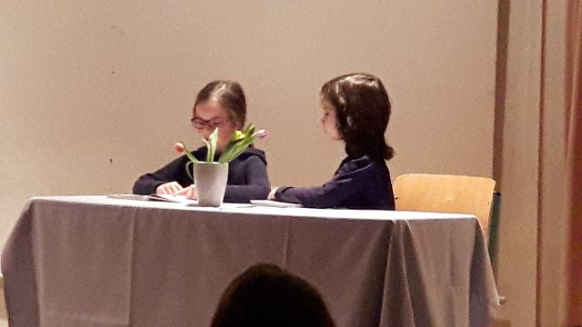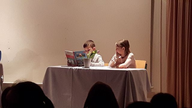 Die Vorschulklasse c sang das „Frühlingslied“. Die Klasse 2c nahm uns mit ihrem auf Englisch gesungenen „Dschungel-Lied“ auf eine musikalische Reise in die Tropen mit. Die Klasse 4c präsentierte ein Gedicht „Der Apfelbaum ist aufgeblüht“ und lies den Apfelbaum vor unseren Augen aufblühen. Die Klasse 3d trug ein Plattdeutsches Gedicht vor. Die Klasse 3c begeisterte die Zuschauer mit dem „Bechertanz“ zu „Couting stars“. Die Schüler der Klasse 1c warben mit dem Gedicht „Komm lass uns Frieden schließen“ für Frieden für alle auf der Welt.