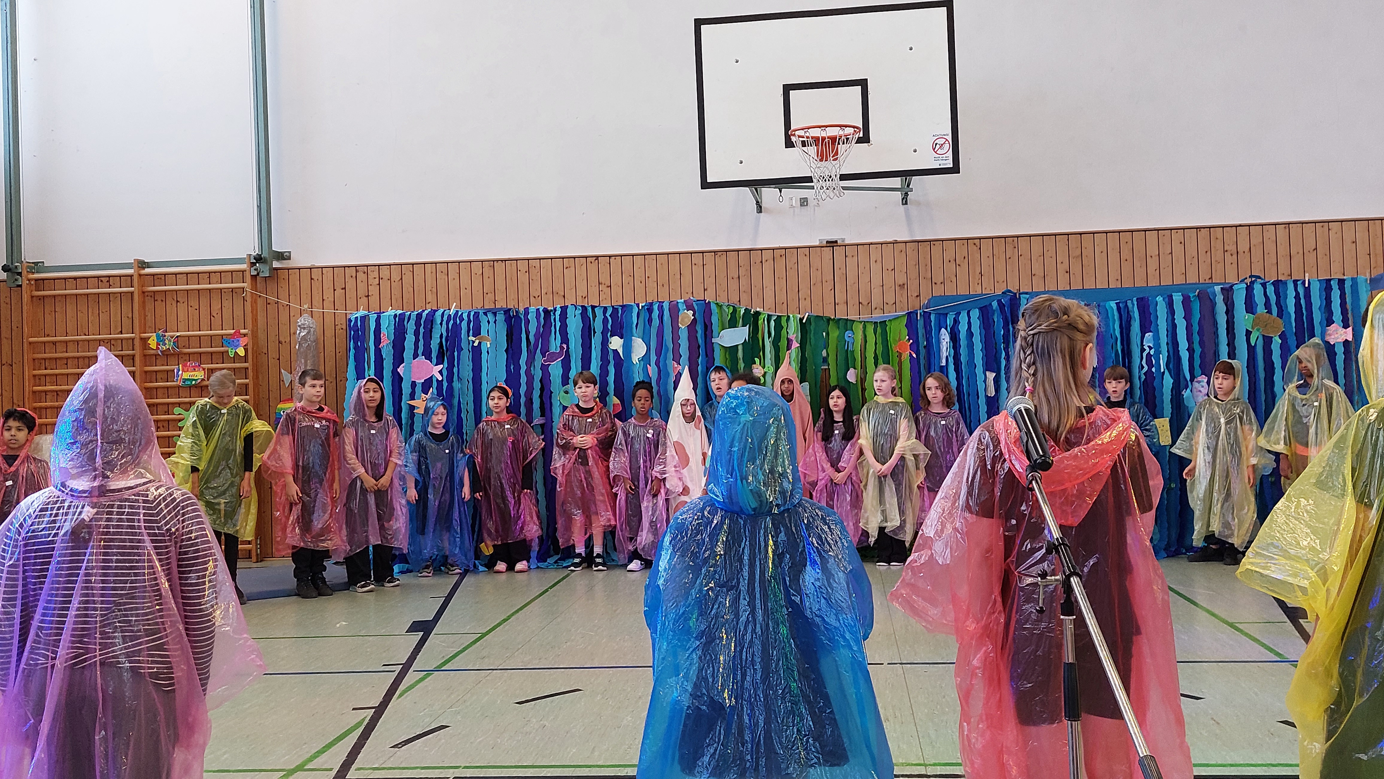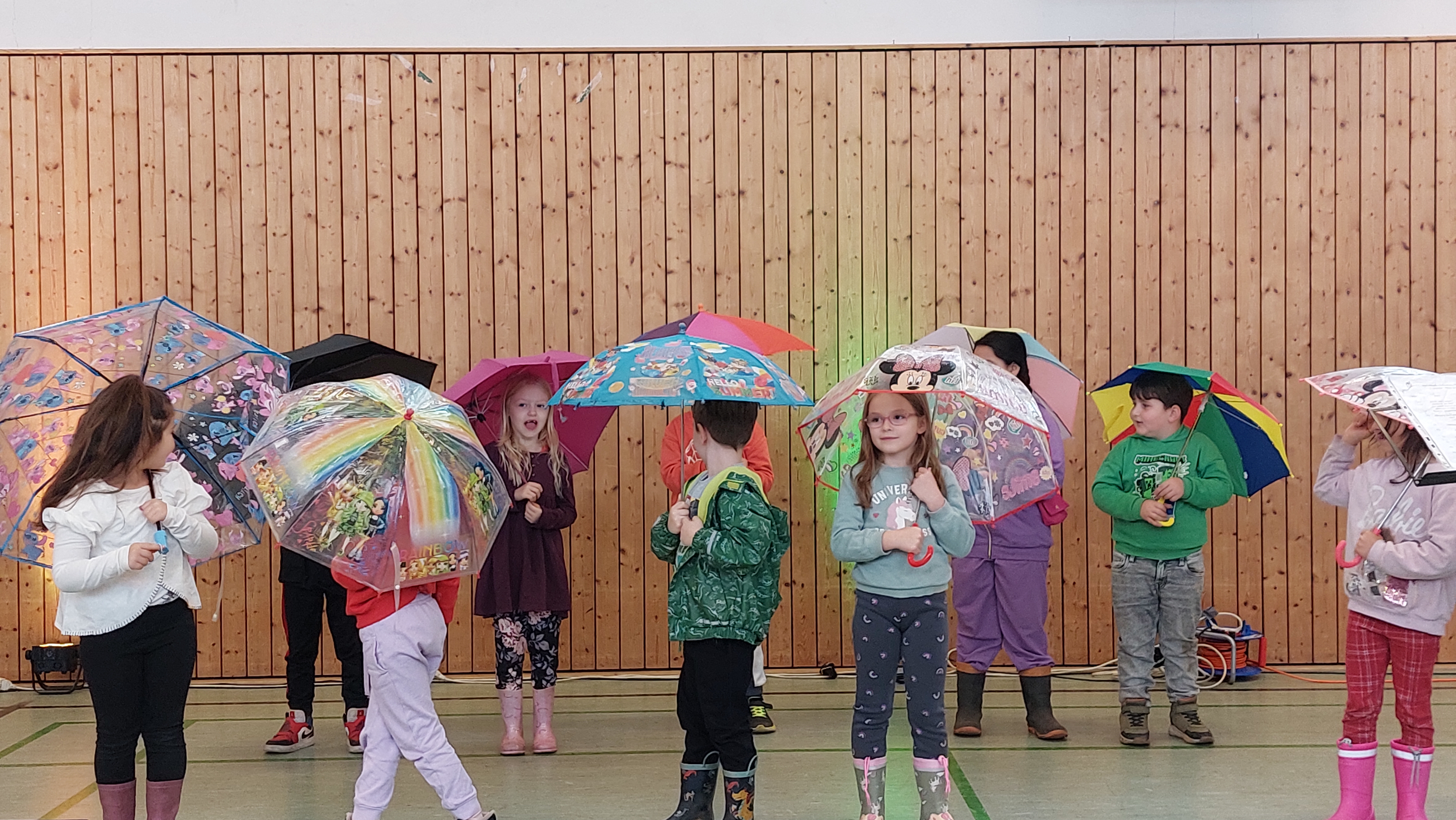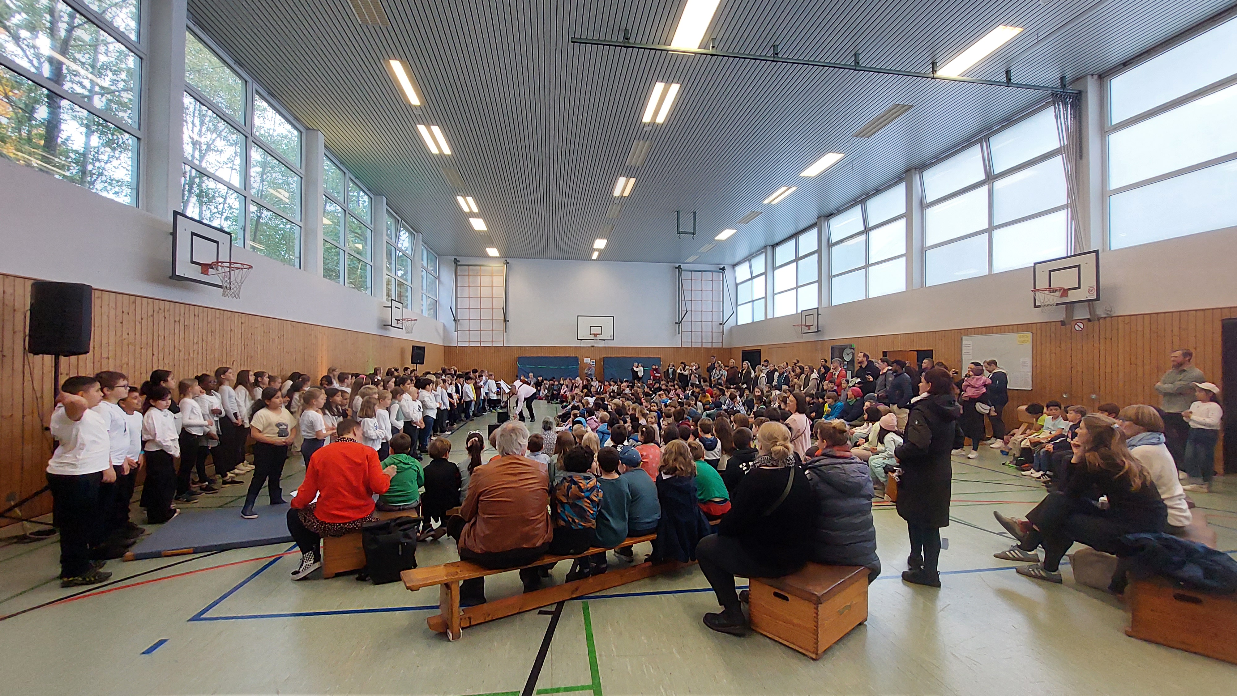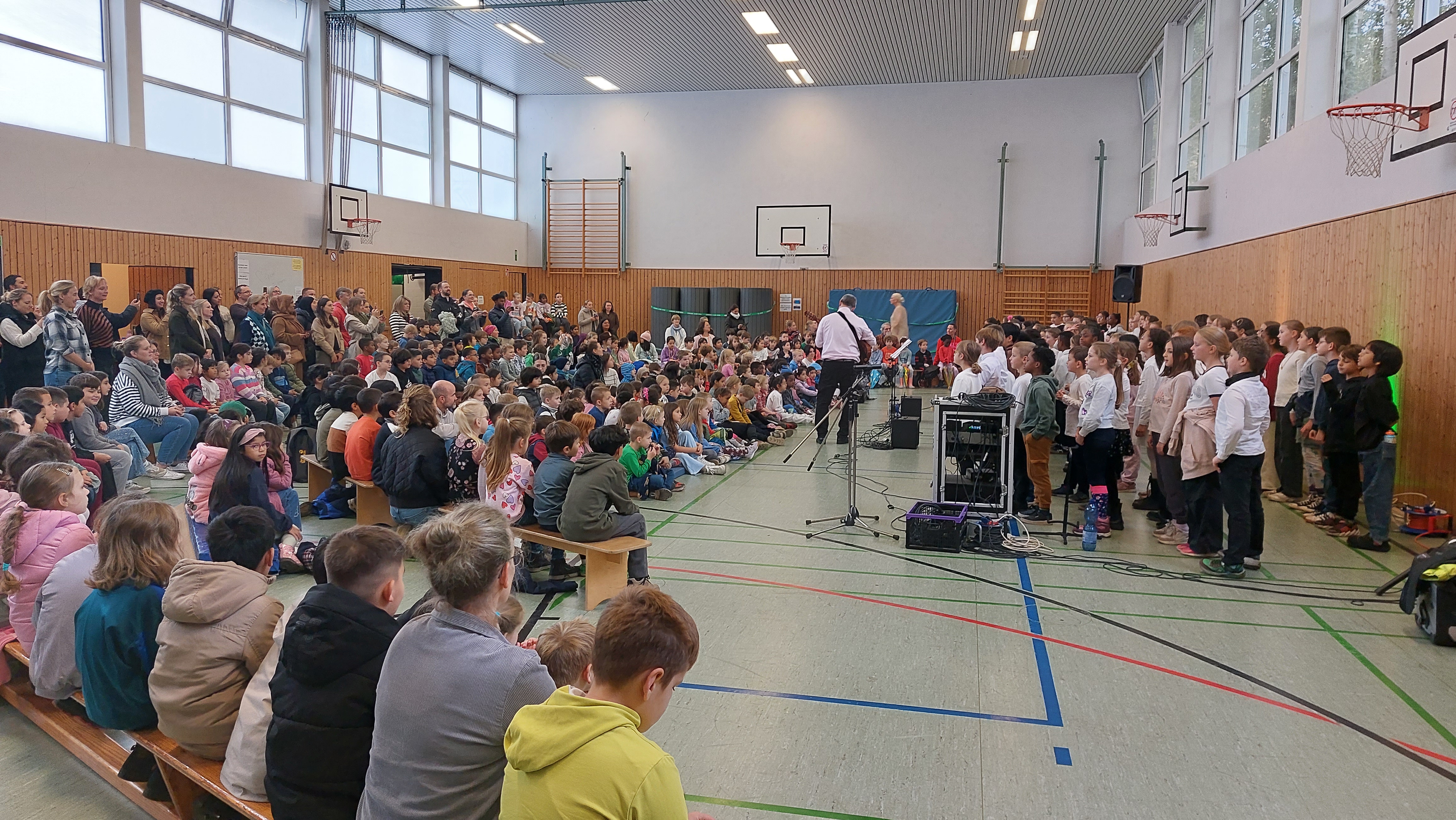 Das abwechslungsreiche Programm wurde in diesem Jahr von den d-Klassen und dem Schulchor gestaltet. Mit Liedern wie „Heute und morgen“, „Schön ist die Welt“ und „Drachen im Wind“ sorgte der Chor unter der Leitung von Herrn Rother gleich zu Beginn für eine fröhliche Atmosphäre. Anschließend trugen die Kinder der Klasse 1d das Gedicht „Regenschirme“ vor – passend zum herbstlichen Wetter. Beim gemeinsamen Lied „Wir holen heut den Drachen raus“ sangen und machten alle begeistert mit. Auch die Klasse 2d stimmte mit ihren „Halloween-Reimen“ auf die kommende Jahreszeit ein, bevor es mit dem „Nebellied“ musikalisch weiterging. Beim „Herbst-Rock’n’Roll“ der Klasse 3d hielt es niemanden mehr still – es wurde geklatscht, gewippt und mitgerockt!Die Klasse 4d präsentierte im Anschluss den „Regenkanon“. Zum Abschluss sangen alle gemeinsam den „Laternenrock“, und so endete das Programm voller Musik, Gedichte und guter Laune schwungvoll.