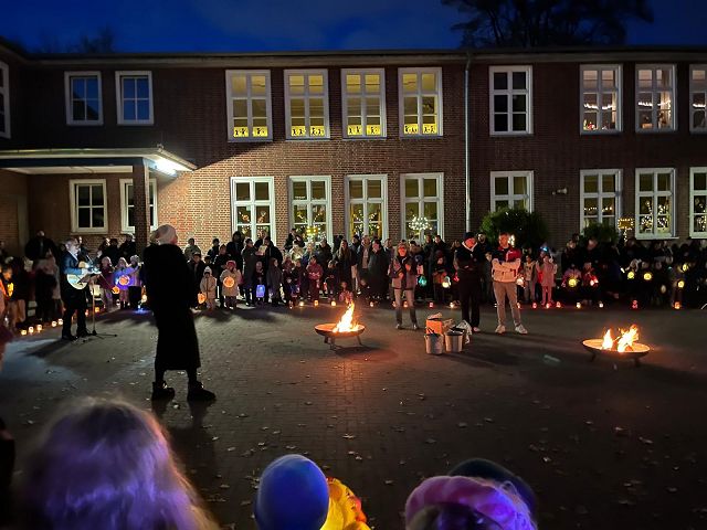 „Dort oben leuchten die Sterne, hier unten leuchten wir.“ Unter diesem Motto kamen am Dienstag, dem 11. November, die Schüler*innen der Schule Furtweg mit ihren Familien zusammen. Mit ihren selbstgebastelten Laternen ließen sie den Schulhof in warmem Licht erstrahlen. Im Schein der bunten Laternen und gewärmt von den Feuerschalen sangen Kinder und Erwachsene gemeinsam Laternenlieder, begleitet von Herrn Rother auf der Gitarre. Die fröhlichen Stimmen und das warme Licht schufen eine besonders festliche Atmosphäre.
