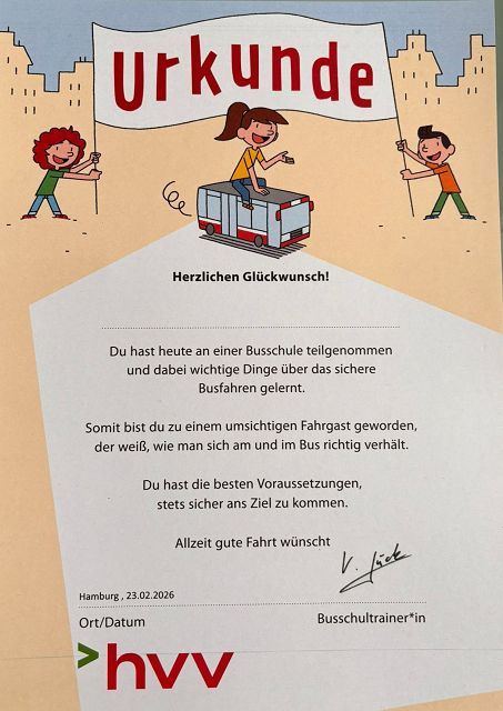 Heute hatten wir einen HVV Bus auf dem Schulgelände. Nein, dieser hatte sich nicht verfahren. Die Busschule vom HVV war zu Besuch bei uns und hat den Kindern eindrucksvoll und auf spielerische Weise elementaren Sicherheitsregeln bei der Fahrt mit Bus und Bahn beigebracht. Das richtige Verhalten in öffentlichen Verkehrsmitteln und das selbständige Fahren im Hamburger Verkehrsverbund (HVV) wurden geübt. Und zum Abschluss gab es noch für jeden eine Urkunde.